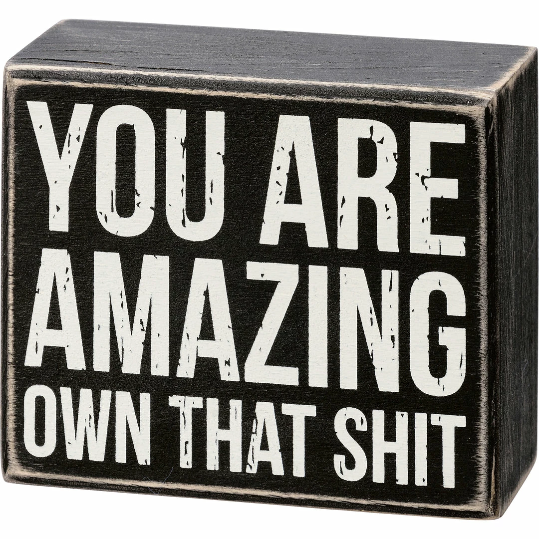A classic black and white box sign featuring a distressed “You Are Amazing Own That Shit” sentiment. Our You Are Amazing Own That Shit box sign is easy to hang or can free-stand alone.