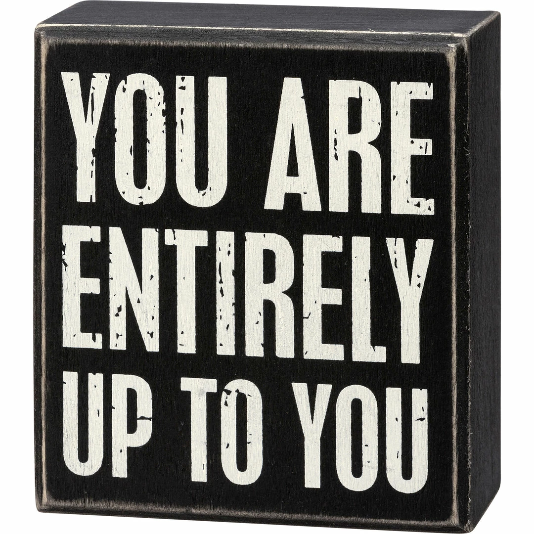 A classic black and white box sign featuring a distressed “You Are Entirely Up To You” sentiment. Our You Are Entirely Up To You box sign is easy to hang or can free-stand alone.