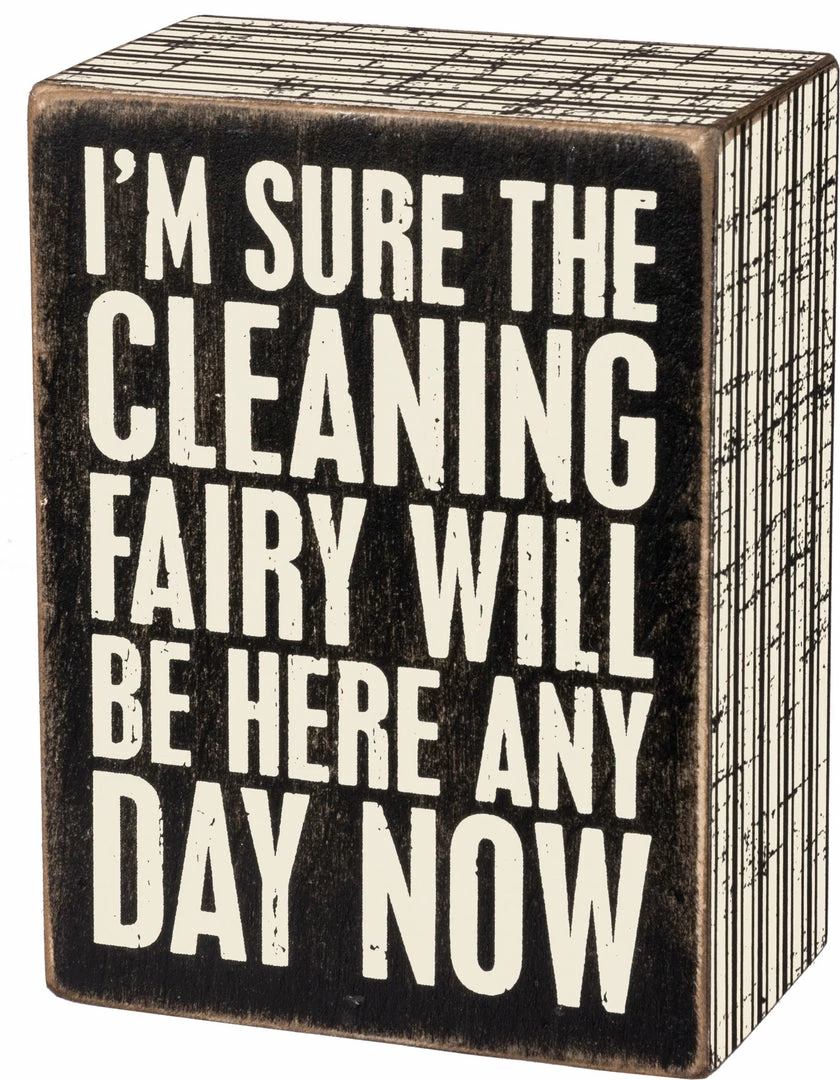 A classic black and white wooden box sign featuring a distressed “I’m Sure The Cleaning Fairy Will Be Here Any Day Now” sentiment with striped trim designs. Easy to hang or can free-stand alone.