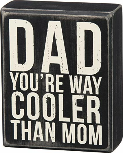 A classic black and white wooden box sign featuring a distressed “Dad – You’re Way Cooler Than Mom” sentiment. Easy to hang or can free-stand alone. 4″ x 5″ x 1.75″