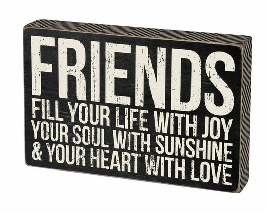 A classic black and white wooden box sign featuring a distressed “Friends Fill Your Life With Joy, Your Soul With Sunshine & Your Heart With Love” sentiment with zigzag trim designs. Easy to hang or can free-stand alone. 10″ x 6.50″ x 1.75″