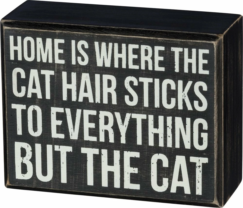 A classic black and white wooden box sign featuring a distressed “Home is Where The Cat Hair Sticks To Everything But The Cat” sentiment. Easy to hang or can free-stand alone.Β 4.50″ x 3.50″ x 1.75″