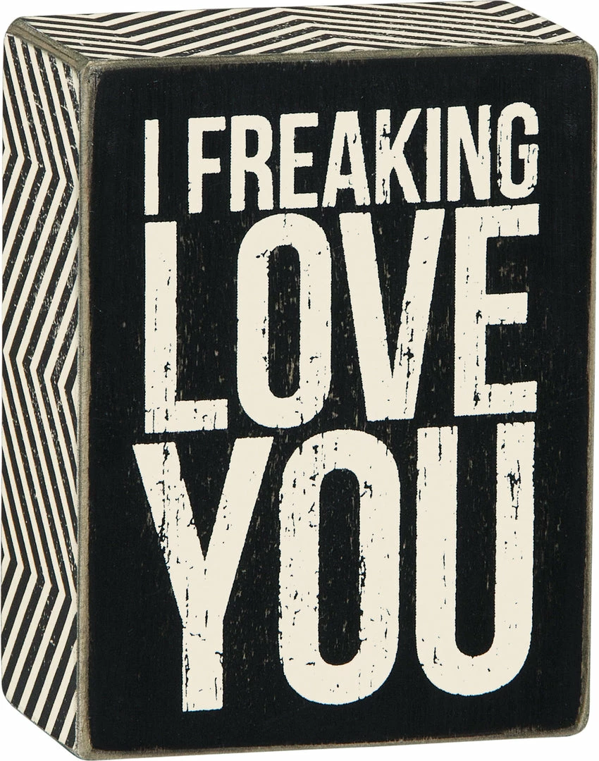 A classic black and white wooden box sign featuring a distressed “I Freaking Love You.” sentiment with zigzag print trim designs. Easy to hang or can free-stand alone.ย 3″ x 4″ x 1.75″