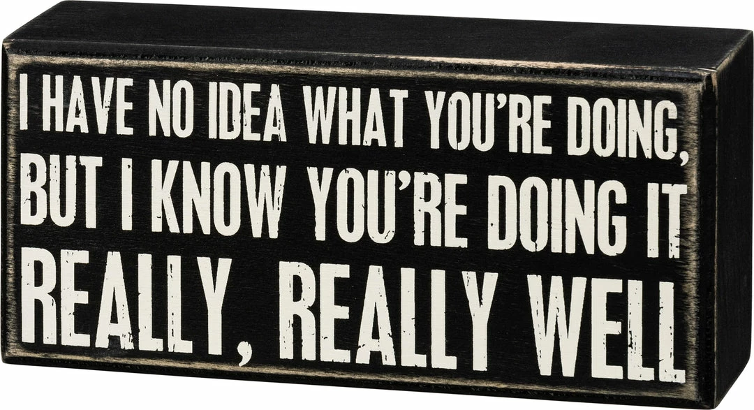 A classic black and white wooden box sign featuring a distressed “I Have No Idea What You’re Doing But I Know You’re Doing It Really, Really Well” sentiment. Easy to hang or can free-stand alone. 6.50″ x 3″ x 1.75″