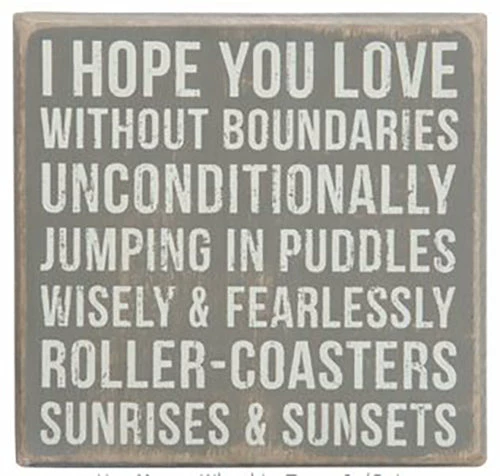 A classic grey and white wooden box sign featuring a distressed “I Hope You Love Without Boundaries Unconditionally Jumping In Puddles Wisely & Fearlessly Roller-Coasters Sunrises & Sunsets” sentiment. Easy to hang or can free-stand alone.