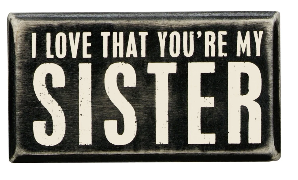 A classic black and white wooden box sign featuring a distressed “I Love That You’re My Sister” sentiment. Easy to hang or can free-stand alone.