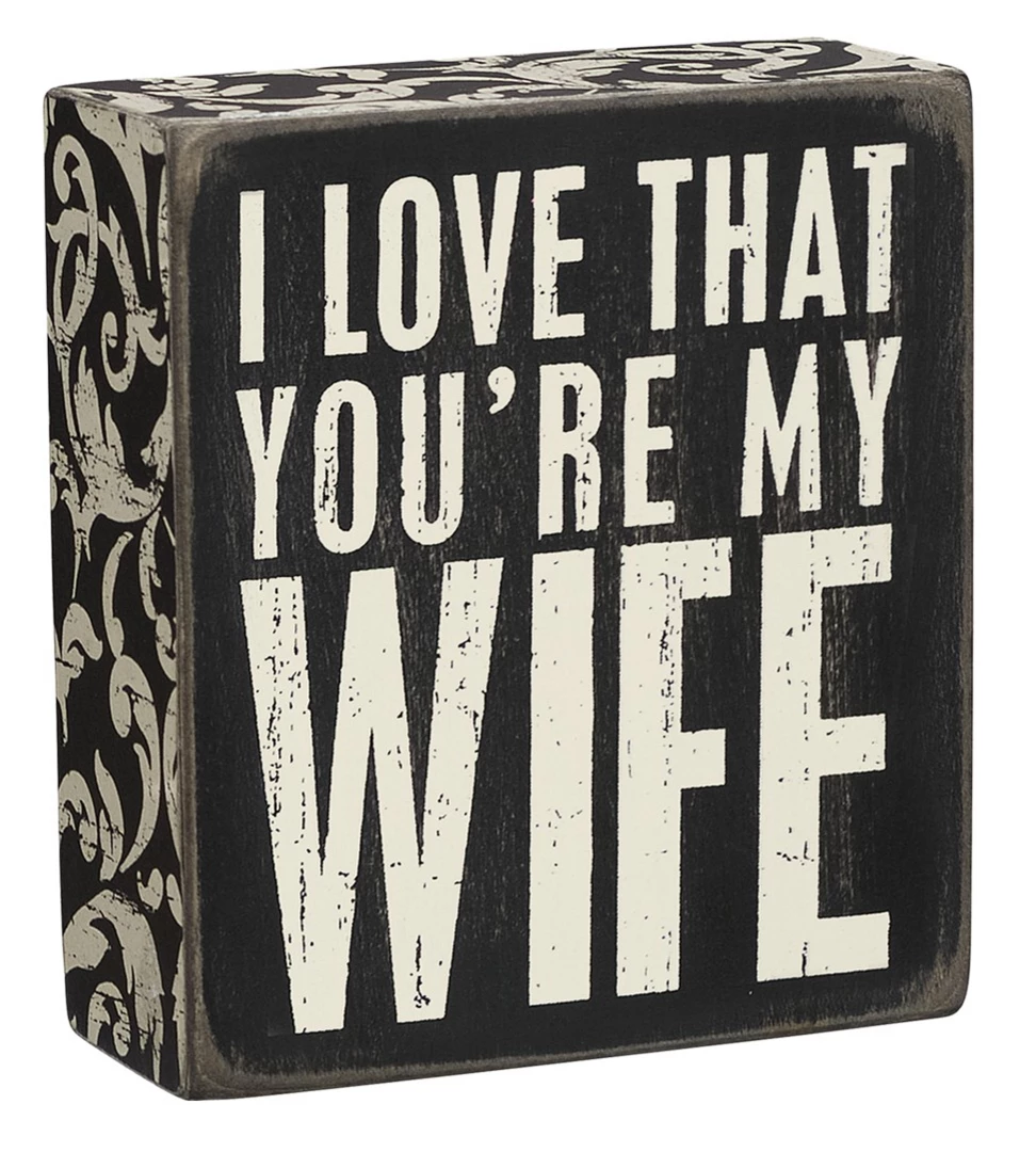 A classic black and white wooden box sign featuring a distressed “I Love That You’re My Wife” sentiment with patterned trim designs. Complements well with existing décor or coordinating design pieces. Easy to hang or can free-stand alone.