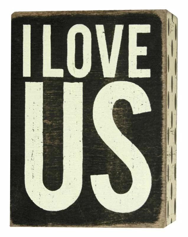 A classic black and white wooden box sign featuring a distressed “I Love Us” sentiment with polka dot trim designs. Easy to hang or can free-stand alone. 3″ย x 4″
