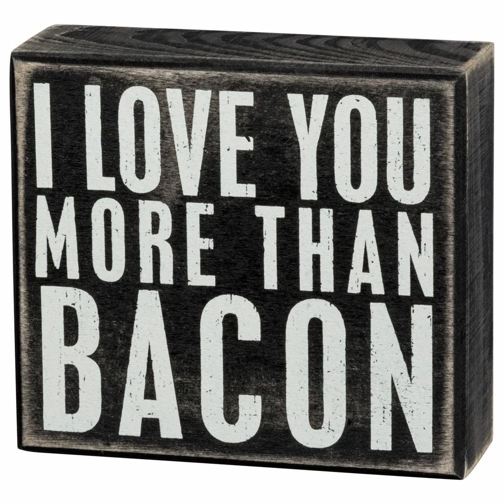 A classic black and white wooden box sign featuring a distressed “I Love You More Than Bacon” sentiment. Easy to hang or can free-stand alone. 5″ x 4.50″ x 1.75″