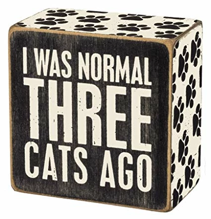 A classic black and white wooden box sign featuring a distressed “I Was Normal Three Cats Ago” sentiment with paw print trim designs. Easy to hang or can free-stand alone. 3″ x 3″ x 1.75″