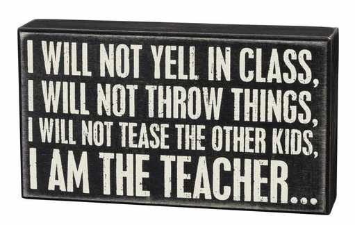 A classic black and white wooden box sign featuring a distressed “I Will Not Yell In Class, I Will Not Throw Things, I Will Not Tease The Other Kids, I Am The Teacher…” sentiment. Easy to hang or can free-stand alone. 8″ x 4.50″ x 1.75″