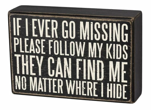A classic black and white box sign featuring a distressed “If I Ever Go Missing Please Follow My Kids – They Can Find Me No Matter Where I Hide” sentiment. Easy to hang or can free-stand alone. 6″ x 4″ x 1.75″ย
