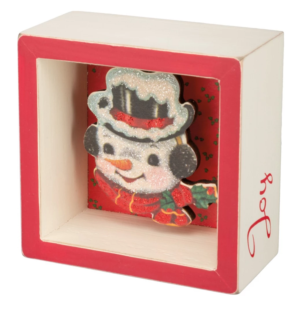 White box with red trim. Joy in script on side of box. Cute image of snowman with glitter snow adorns the inside. Easy to hang or can free-stand alone.