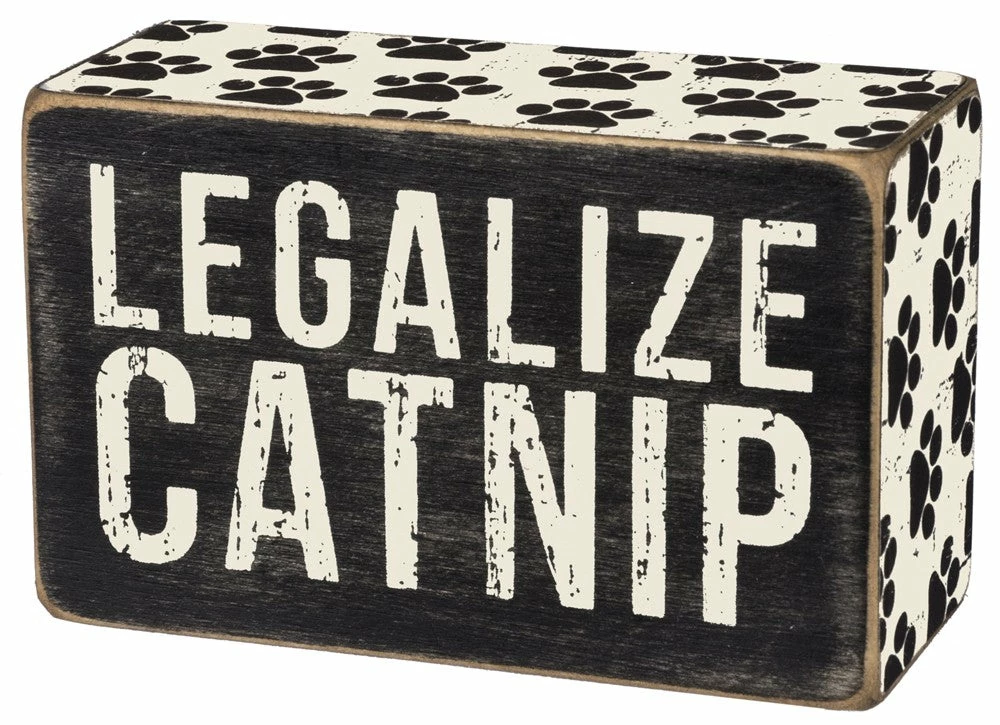 A classic black and white wooden box sign featuring distressed “Legalize Catnip” sentiment with paw print trim designs. Easy to hang or can free-stand alone. 4″ x 2.50″ x 1.75″