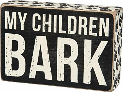 A classic black and white wooden box sign featuring a distressed “My Children Bark” sentiment with paw print trim designs. Easy to hang or can free-stand alone. 6″ x 4″ x 1.75″