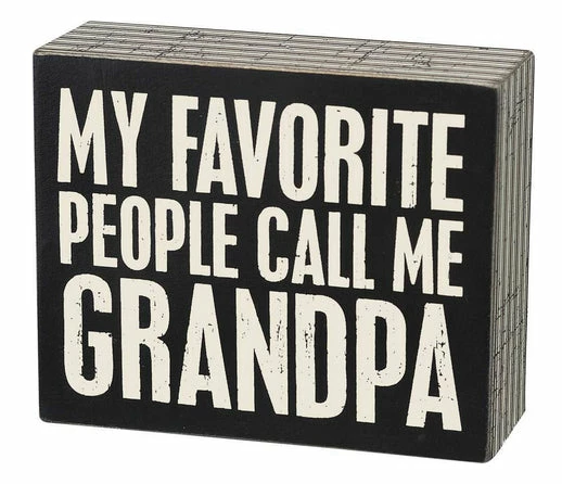 A classic black and white wooden box sign featuring a distressed “My Favorite People Call Me Grandpa” sentiment with striped trim designs. Easy to hang or can free-stand alone. 5″ x 4″ x 1.75″