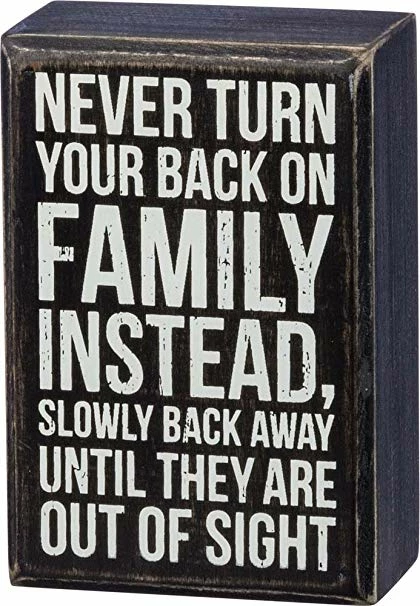 A classic black and white wooden box sign featuring a distressed “Never Turn Your Back On Family – Instead, Slowly Back Away Until They Are Out Of Sight” sentiment. Easy to hang or can free-stand alone. 3″ x 4.50″ x 1.75″