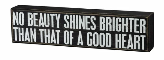 A classic black and white box sign featuring a distressed “No Beauty Shines Brighter Than That Of A Good Heart” sentiment. Easy to hang or can free-stand alone. 12″ x 3″ x 1.75″