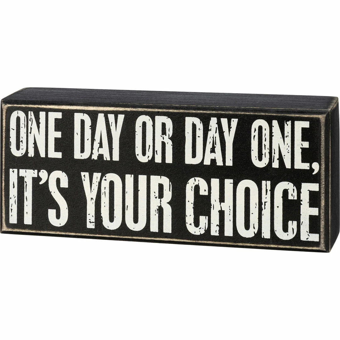 A classic black and white wooden box sign featuring a distressed “One Day Or Day One, It’s Your Choice” sentiment. Easy to hang or can free-stand alone.