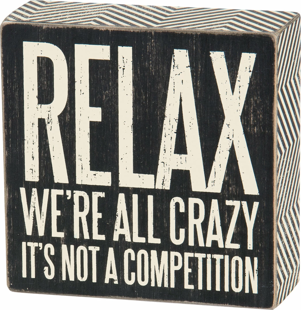 A classic black and white wooden box sign featuring a distressed “Relax – We’re All Crazy It’s Not A Competition” sentiment with zigzag trim designs. Easy to hang or can free-stand alone. 5″ x 5″ x 1.75″