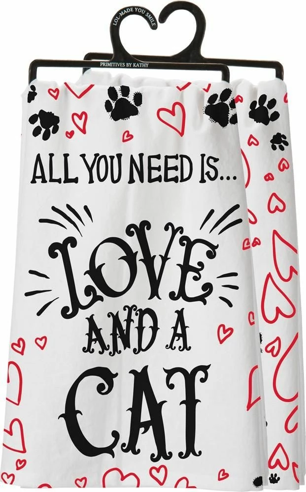A cotton dish towel lending “All You Need Is… Love And A Cat” hand lettered sentiment with heart and paw print designs throughout to make for charming kitchen dรฉcor. Cotton, machine-washable, measures 28″ x 28″. Sold individually.