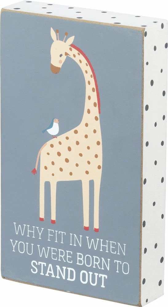 Add personality and character to any space with this wooden box sign, featuring a giraffe and bird design, playful “Why Fit In When You Were Born To Stand Out” sentiment, and polka dot patterned trim.Β Easy to hang or can free-stand alone. 3.50″ x 6″ x 1″
