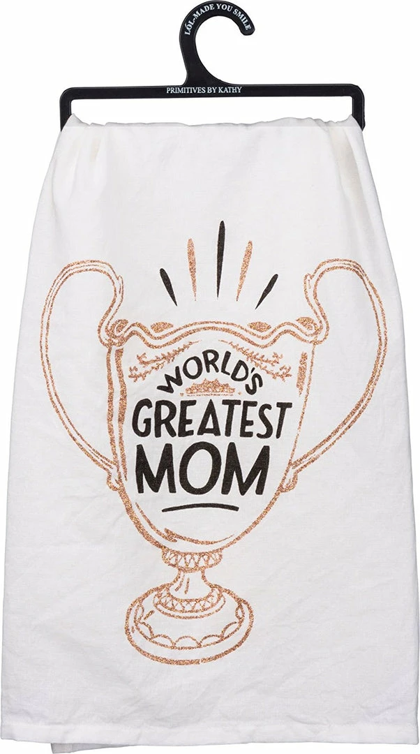 A cotton dish towel lending “World’s Greatest Mom” hand lettered sentiment with trophy design and gold glitter accents. Great for gifting to make for special kitchen dรฉcor. Cotton, machine-washable, measures 28″ x 28″. Sold individually.