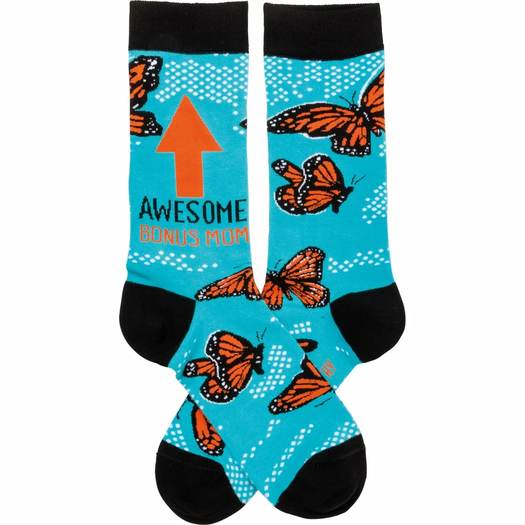 A pair of socks featuring “Awesome Bonus Mom” sentiment with butterfly pattern. One size fits most. Cotton, nylon, spandex. One size fits most.
