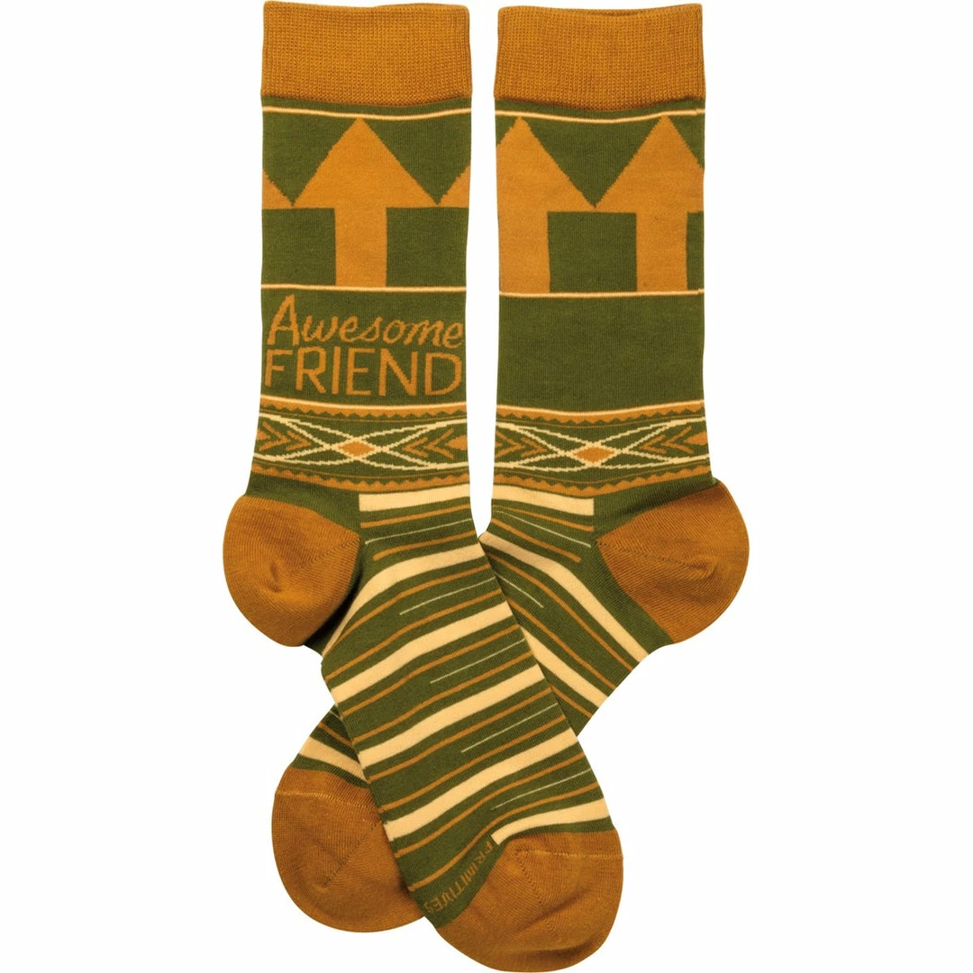 A pair of socks featuring “Awesome Friend” sentiment with geometric pattern. One size fits most. Cotton, nylon, spandex. One size fits most.