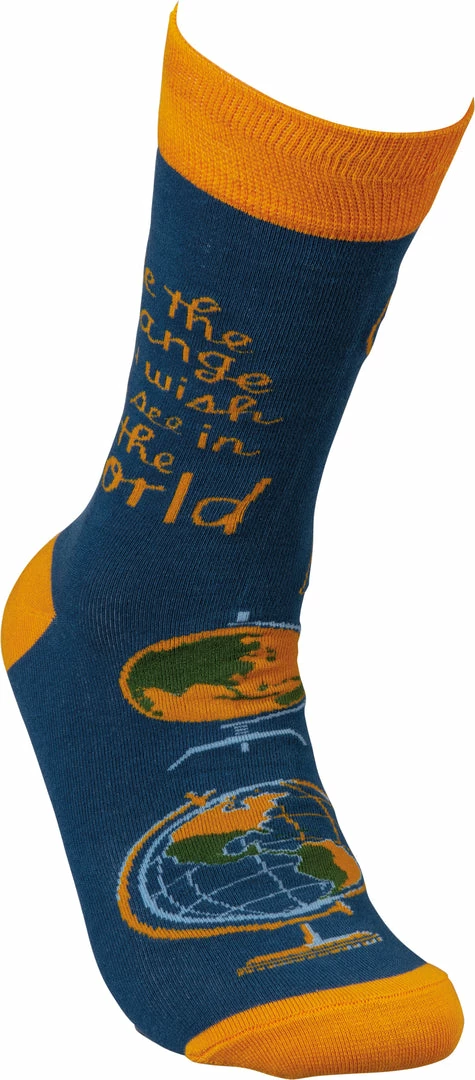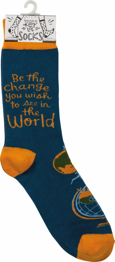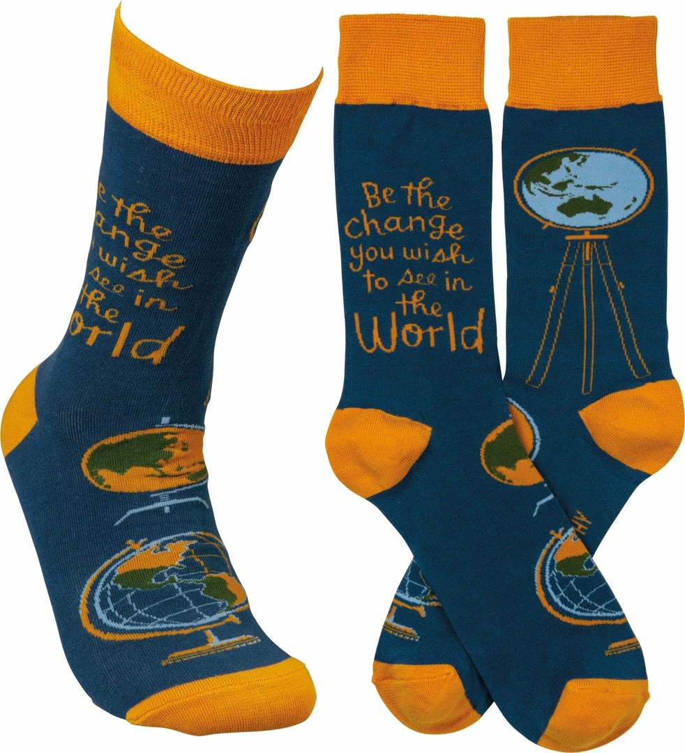 Colorfully printed socks lending a “Be The Change You Wish To See In The World” sentiment with globe designs. One size fits most. Cotton, nylon, spandex. One size fits most.