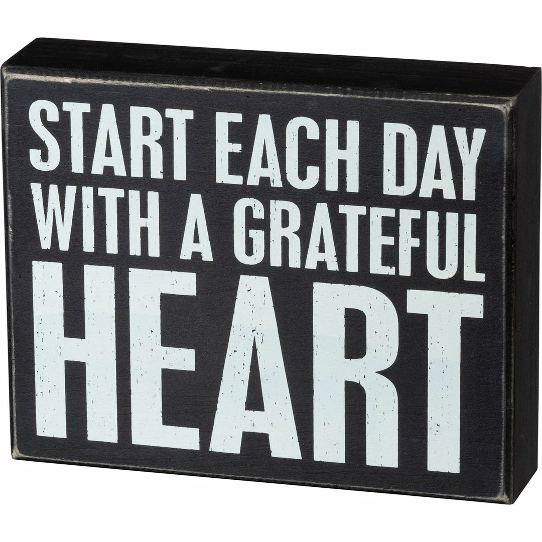 A classic box sign featuring a “Start Each Day With A Grateful Heart” sentiment. Easy to hang or can free-stand alone. 7.50″ x 6″ x 1.75″