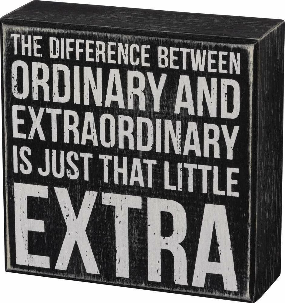 A classic black and white box sign featuring a distressed “The Difference Between Ordinary And Extraordinary Is Just That Little Extra” sentiment. Easy to hang or can free-stand alone. 5″ x 5″ x 1.75″