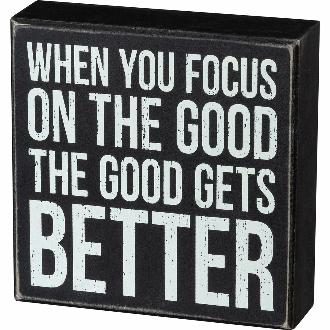A classic box sign featuring a “When You Focus On The Good The Good Gets Better” sentiment. Easy to hang or can free-stand alone. 6″ x 6″ x 1.75″