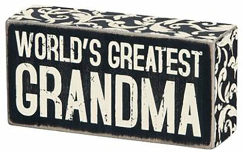 A classic black and white wooden box sign featuring a distressed “World’s Greatest Grandma” sentiment with floral trim designs. Easy to hang or can free-stand alone.