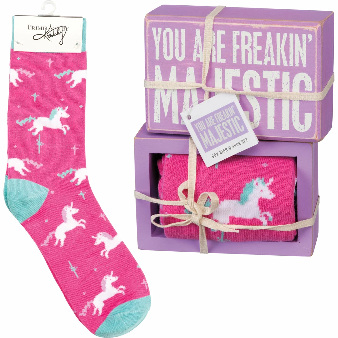 A perfectly giftable set including a box sign with “You Are Freakin’ Majestic” sentiment with a pair of socks with complementing unicorn designs. Socks are cotton, nylon and spandex and are machine washable. Box Sign: 3″ x 4.50″ x 1.75″, Socks: One Size Fits Most