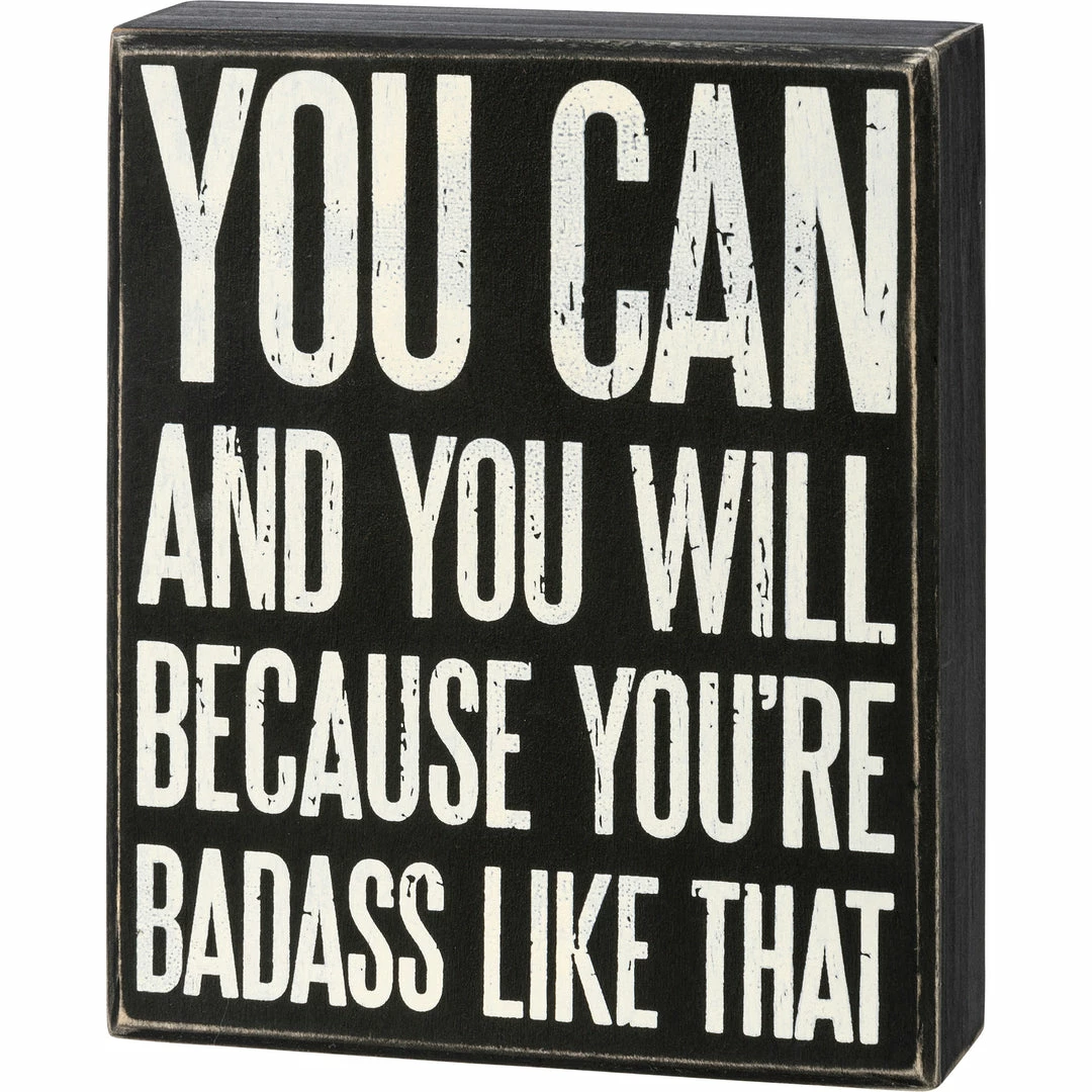 A classic black and white wooden box sign featuring a distressed “You Can And You Will Because You’re Badass Like That” sentiment. Easy to hang or can free-stand alone.