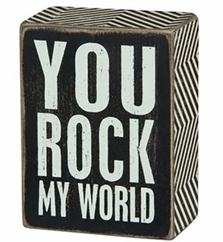 A classic black and white wooden box sign featuring a distressed “You Rock My World” sentiment with zigzag trim designs. Easy to hang or can free-stand alone.