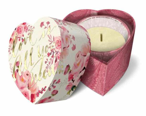 Our heart candles make a pleasantly scented statement of love. This candle is incased in pink mercury glass with gold foil details, with a sweet blossoms scented 5-ounce candle stored in a heart-shaped box.