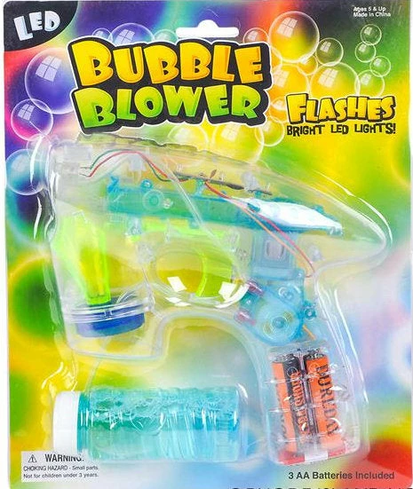 7’’ Transparent Light-Up Bubble Blaster, comes with one bottle of bubble solution and batteries. For ages 5 and up.