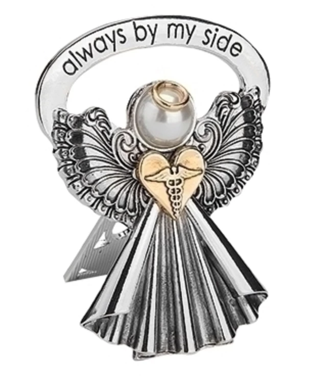 Provide a sweet reminder of the nearness of your guardian angel nurse with this diminutive little bedside figurine. Her inscription reads, “Always by my side,” the angel measures 2.5″ in height and is made with a zinc alloy that is lead free with beautiful accents. The angel has an easel stand so she can easily reside on a bedside table, desk, or anywhere else. A wonderful and meaningful gift from the inspired designs of the Alexa’s Angels collection of Roman, Inc. gifts.