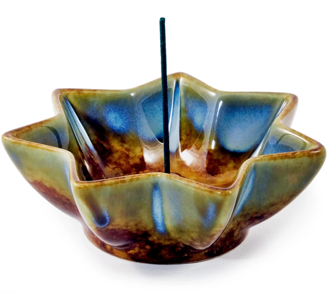 This beautiful new incense holder is inspired by the timeless beauty of sun-dappled lotus blossoms adorning the surface of a quiet pond. A unique addition to our colorful array of glazed ceramic incense holders!
