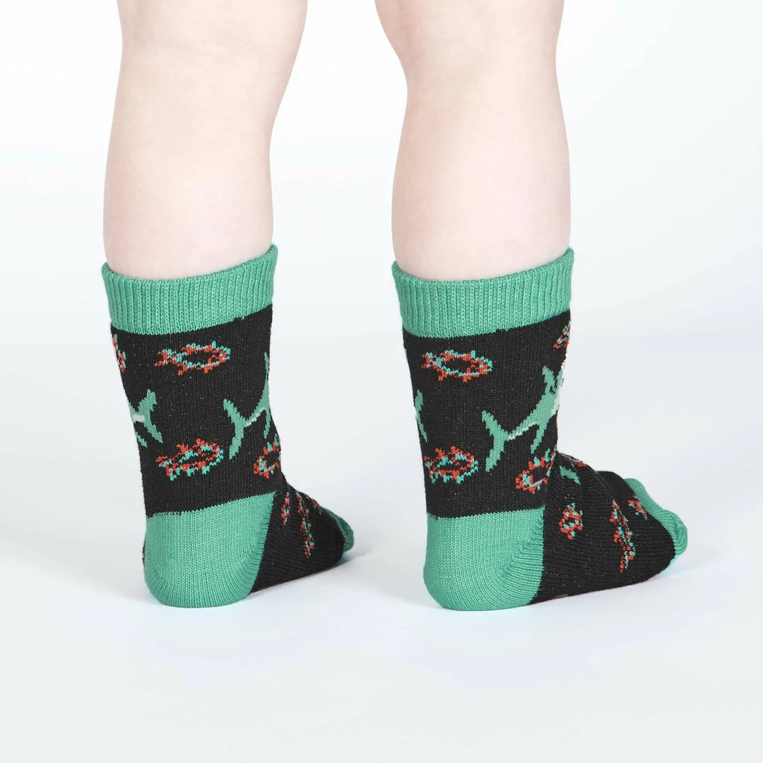 Don’t squint, these sharks are actually in 3D! That and squinting will actually make them harder to see as they attack you. Sharks already have excellent vision, so we can only assume the guy wearing the 3D glasses is on his way to a movie. You weren’t invited, which is good, because you’d probably be the snack. However, you are invited to pop on some 3D glasses when wearing this toddler crew sock and see the shark graphics pop off your ankle.