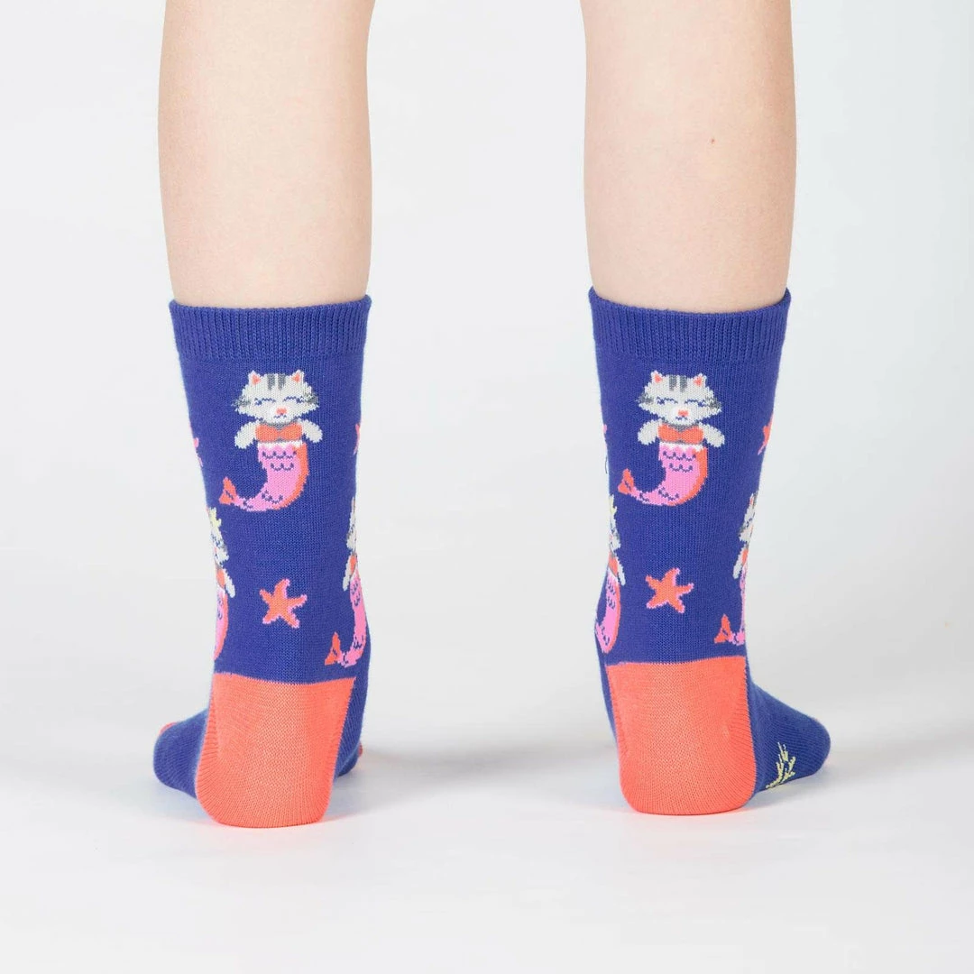 Purrmaids. These elusive creatures were discovered off the coast of Cat Pun island. We were visiting to see if we could find any more of our beloved Caticorns, but discovered these aquatic beauties instead. We quickly captured their essence on knee high socks and brought them back to land for all of you. It’s so rare to find these colors together in nature (or these animals—fish and cats getting along?) or on clothing, so we’re pleased to bring them to your wardrobe!