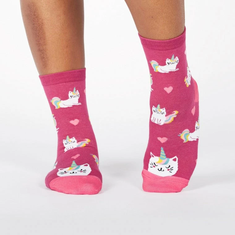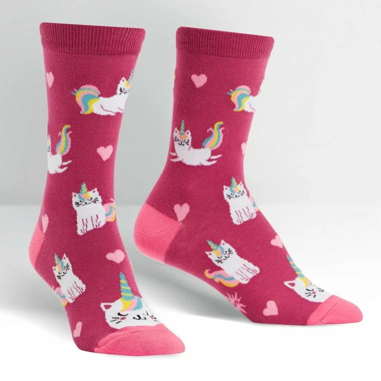 When the cat started prancing around the house like a horse, we thought it was weird. Then she started refusing all food except carrots and rolled oats, and we noticed rainbow fur mixing with her tail fur. We wondered if she might be dying it, but where would she get the dye? Finally, a horn started sprouted from her forehead. Thatโs when we were sure our kitty was slowly morphing into a unicorn. Now all she does it strut around the place going, โLook at me meow!โ We donโt know what will happen next, but it gave us a great idea for these Look at Me Meow Crew Socks.
