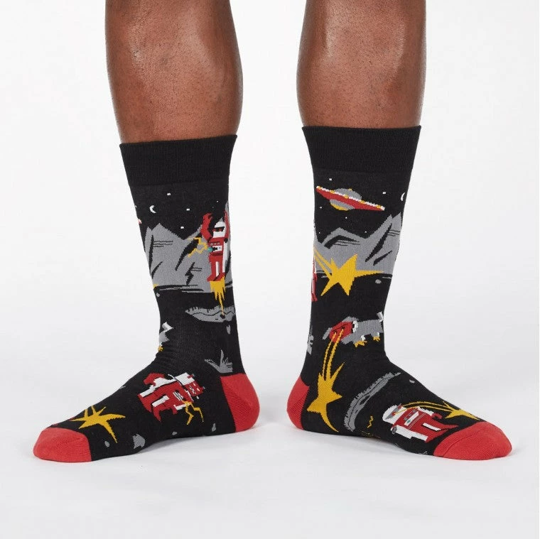 On a distant planet, robot war is being waged every moment of every day. What are they fighting over? A rare mineral thatโs unique to this planet, essential to the production of fighting robots. Without this mineral, it would be impossible to manufacture additional fighting robots. And without additional fighting robots, the war effort would be doomed. So, as you can see, we have little choice. We must continue fighting so we can acquire more of the mineral so we can build more robots to keep fighting. The situation is even more dire than what is indicated on these Zap! Zap! Crew Socks.