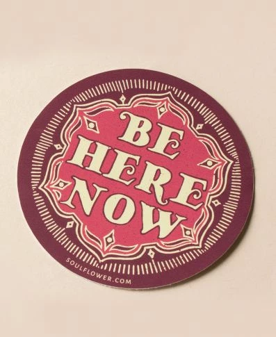 Live in the present and let the past and future fade away with this Be Here Now sticker. Outdoor safe vinyl sticker. Made in the USA. 3.25 inch circle.