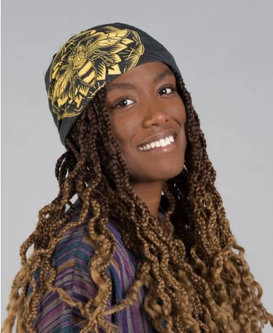 Express your love for all bees in the world when you wear this Bee Mandala Boho Headband. This bee artwork is complete with power, beauty, and inspiration. Our versatile boho headband design can be worn multiple ways – headband, neckerchief, face cover, or wrapped as a bracelet. Made in the USA. 50% organic cotton, 50% recycled plastic (from recycled beverage bottles). 9 inches wide by 8 inches tall (laying flat) – fabric can stretch from 18 to 26 inches in circumference. Eco Black.
