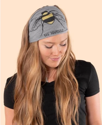 Bee your own kind of bee-autiful! Rock this Bee Yourself Boho Headband with its hand printed image of a bee and the text: Bee Yourself. Wear this organic fabric with raw seams as a head piece or face covering. 9 inches wide by 8 inches tall (laying flat) – fabric can stretch from 18 to 26 inches in circumference. Eco Gray.