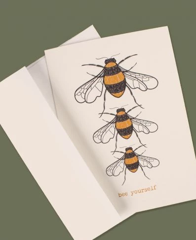 Just bee yourself and everything will fall into place! Let the kind bees on this eco-friendly greeting card inspire your friends and loved ones to bee kind, bee cool, and bee yourself. Features an original illustration of three bees with the words, ‘bee yourself’ on the front. Blank inside with a matching envelope. Made in the USA. 100% post consumer recycled paper. 5 x 7 inches, by Soul Flower.