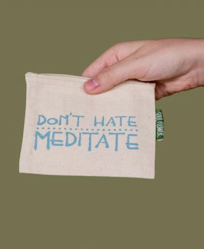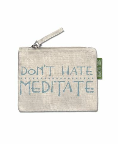 Glide your spirit into serenity – don’t hate, meditate! This zipper pouch is ideal for holding crystals, jewelry, coins, lighters or other small items you want to keep close but keep stashed. Pair with our Donโt Hate Meditate Large Zipper Pouch and Donโt Hate Meditate Eco Tote Bag for a collection of eco-friendly, peaceful vibes. 5.5 x 4.5 inch pouch. Fair Trade Certified. Hand printed in the USA. 100% organic cotton.